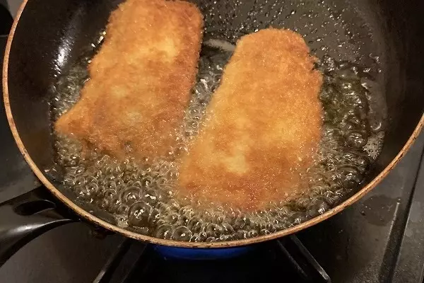 9.いよいよ「ニンニク」を取り出したオリーブオイルに「パネした寒ブリ」を投入。「オリーブオイル」は温度が上がりやすいので、弱火からスタートしてください。「寒ブリ」からシュワシュワと泡が出ていればOKです。途中で裏側の焼き色を確認しつつ、狐色が確認できたら反転です。