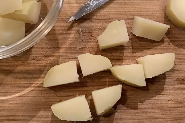 ・「ジャガイモ」は15mm幅に輪切りにし、さらにそれを十字に4等分します。