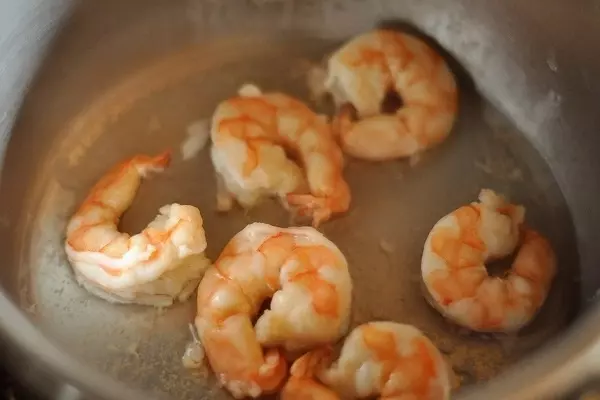 3、<調味料>とエビの蒸し汁を加えて煮汁が少なくなるまで炒める。
