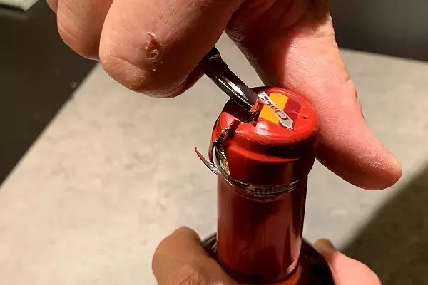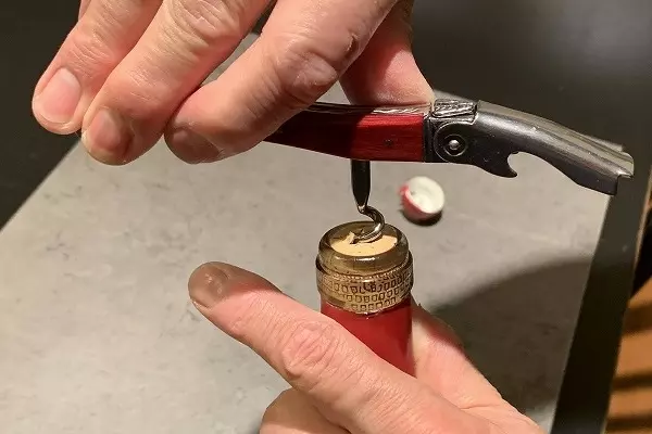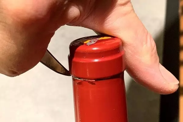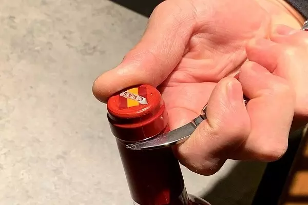 1、まずナイフを起こしキャップシールを剥がします。ボトルにくぼみがありますので、そ