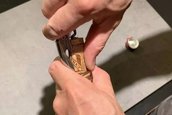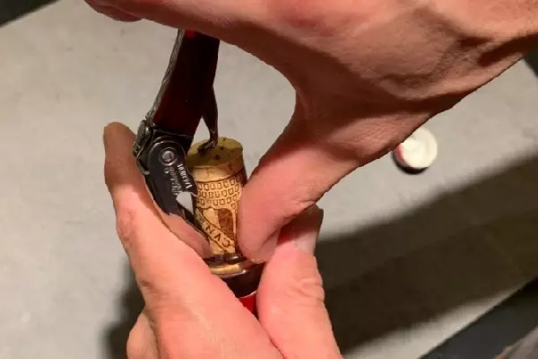 5、コルクがむき出しになりました。ナイフを倒し先端を真ん中に押し当てます。少し力を