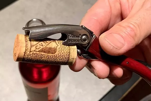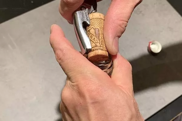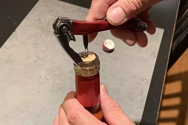 ヴィンテージの若いワイン、つまり現在に近いワインですとほとんどコルクが折れることはありませんが、ナイフを立てたときにかける力の向きを前に倒してしまいますと、ボトルの口が支点になり中に残ったコルクが悲鳴をあげます。