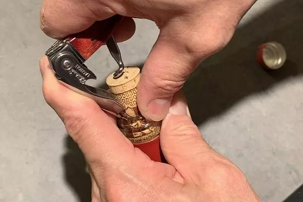7、ボトルをしっかりと握りナイフを時計回りに回せばスクリューが下へと刺さってゆきます。スクリューを少し残し、回転を止めテコの金具をボトルの口に引っ掛けます。