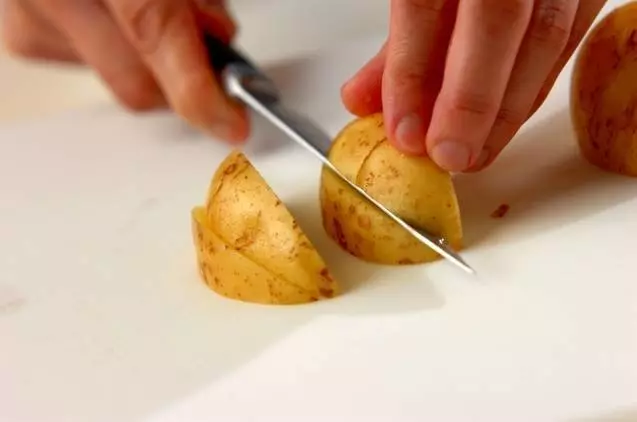 ・新ジャガイモは皮つきのまましっかり洗い、6~8等分のくし切りにする。