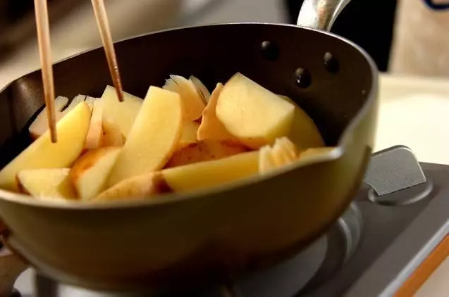 1、フライパンにバターを中火で熱して、新ジャガイモと水煮タケノコを焼く。