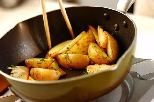 2、新ジャガイモに竹串が通り、焼き色がついたら、パセリを加えて全体にからめる。器に盛り、岩塩を振る。