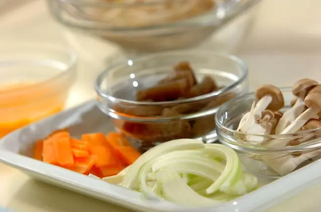 手順1:鍋にゴマ油を中火で熱し、コンニャク、ニンニク、玉ネギ、ニンジンをしんなりするまで炒めます。
