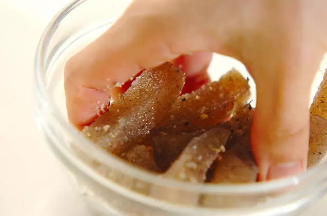 手順4:コンニャクはスプーンで小さめのひとくち大にちぎり、混ぜ合わせた<漬けダレ>の材料をもみ込みます。