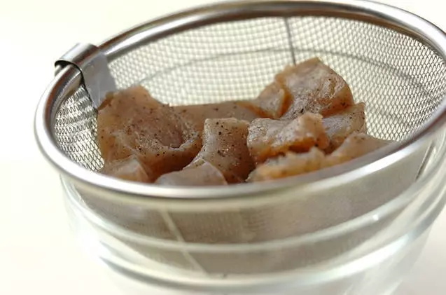 手順1:コンニャクに小麦粉をつけ、170℃くらいの揚げ油に入れる。最後に強火にして、カラッと揚げます。