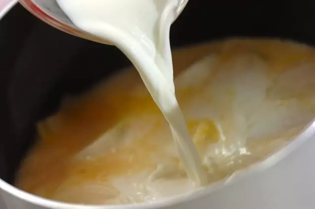蒸らしたら蓋を取り、牛乳200ccを入れて弱火を付けます。このとき、蓋はせずに吹きこぼれないように気を付けながらへらでゆっくりと混ぜます。ここでのおいしさを保つポイントは沸騰させないことです。
