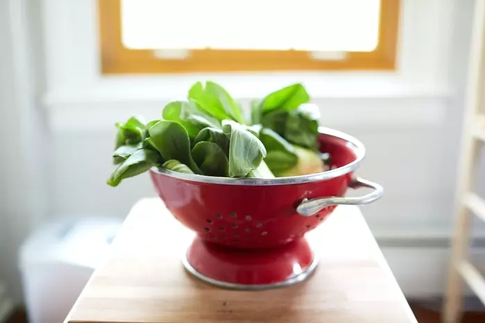 - チンゲン菜の根元を、水を張ったボウルにつけて、ザルにあげて水気をよく拭き取る