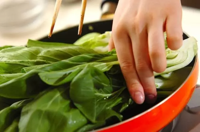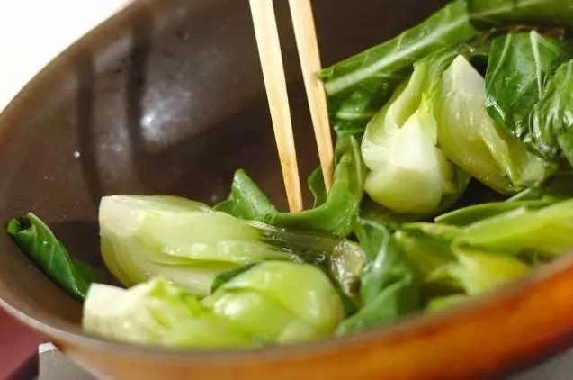 手順2:チンゲンサイを根元側から加え、しんなりしたら葉を加える。煮汁をからめるようにサッと煮て、葉の色が鮮やかになったら器に盛る。