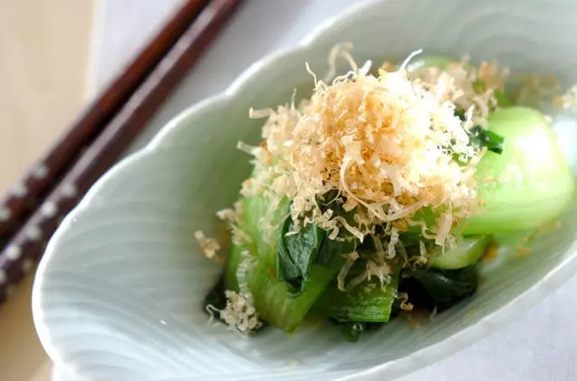 手順1:たっぷりの熱湯に塩を入れ、チンゲンサイをサッとゆでて水に取る。粗熱が取れたら水気を絞り、<浸し汁>のボウルに加えて和える。器に盛り、かつお節をかける。