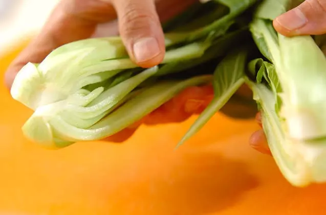 - チンゲンサイは根元を切り落とし、長さ3~4cmに切る。
