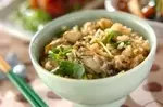 手順3:炊き上がったらカキをのせ、10分そのままで蒸らす。ミツバを加えて全体に軽く混ぜ合わせ、余分な水分を飛ばし、茶碗によそう。