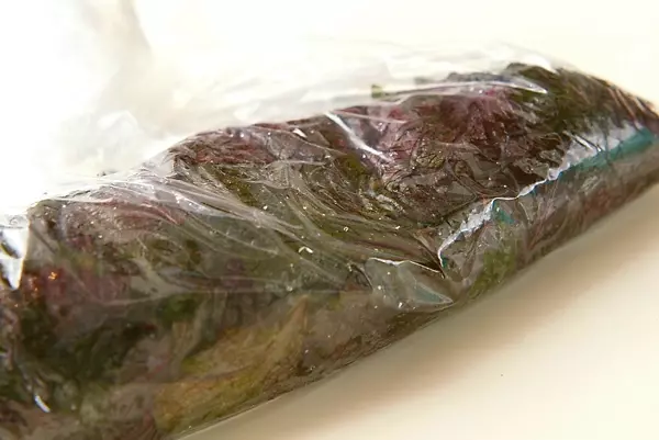 7、ビニール袋に(6)の赤じその葉、粗塩の半量を入れ空気を入れた風船状にしてビニール袋の口を持ち、軽く振って全体に粗塩をからめる。空気を抜いて5~6分置くとしっとりしてくるので、袋ごとよくもみ、濁った黒っぽい紫色の汁が出てくれば、袋ごとしっかり絞って汁気を捨てる。