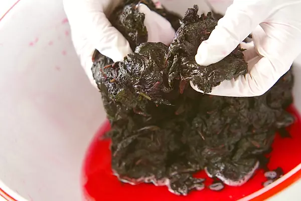 8、ボウルに(7)の赤じそを入れ、葉を破らないようにほぐし、残りの粗塩を加え押すようにもむ、(7)の時よりは少しきれいな汁が出てくるので、(7)同様ぎゅっと絞って汁を捨てる。