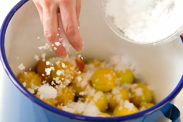 黄熟していない梅の場合は、常温に置き、黄熟させ下さい。傷があったり、斑点がある梅は取り出しておく。
