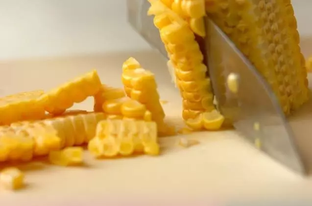 とうもろこしを通常より固めに茹でます。②包丁で粒をそぎ落とす