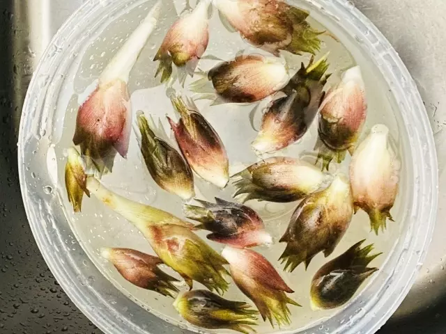 表面の汚れはぬめりの原因になるので、水でよく洗い流します。みょうがの軸が傷んでいる場合はそこから傷みが進むので、切っておきましょう。②水とみょうがを保存容器に入れる