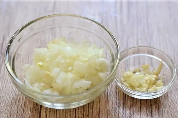 ・玉ネギとニンニクはみじん切りにする。<作り方>