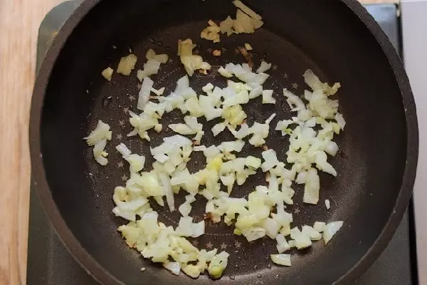 1、フライパンにオリーブ油とニンニクを入れて中火にかける。玉ネギを入れて、透き通るまで炒める。