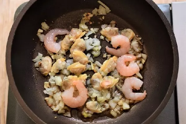 2、むきエビとアサリを入れて、白ワインをふり、蓋をして表面の色が変わるまで蒸す。