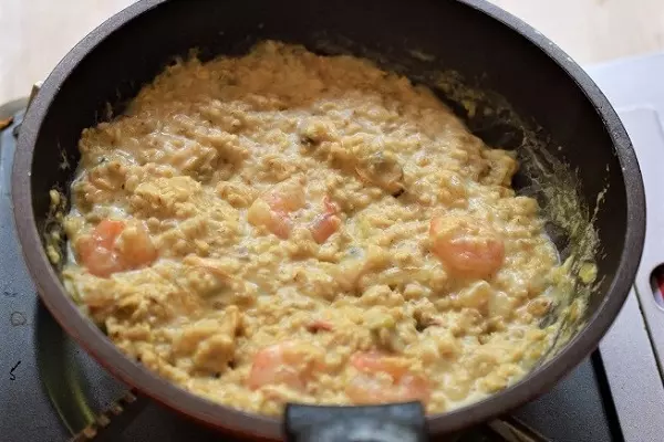 3、豆乳に浸したオートミールを豆乳ごと加える。ひと煮立ちしたら火を弱め、トロミが出るまで煮る。