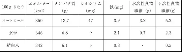 「オートミール」は、全粒穀物なので、精白された穀物と比べ、ビタミン、ミネラル、食物繊維などの栄養が豊富です。エネルギー源となるデンプン、日本人の食生活に不足しがちな「カルシウム」「鉄」その他ビタミンとミネラルがバランス良く含まれます。タンパク質も穀類の中では多いのも特徴的です。水溶性食物繊維、不溶性食物繊維とも多いですが、特に水溶性食物繊維であるβグルカンが多く含まれており、腸内の善玉菌の増殖を促進し、腸内環境の改善や、免疫力アップが期待できます。