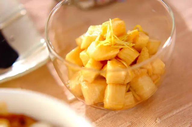 電子レンジで作る簡単甘酢漬け。ユズ皮の香りが上品です。