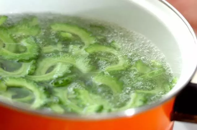 鍋にお湯をわかし、スライスしたゴーヤを10~20秒ほどサッと茹でます。茹でたら冷水で冷やし、すぐに水分をふき取りましょう。