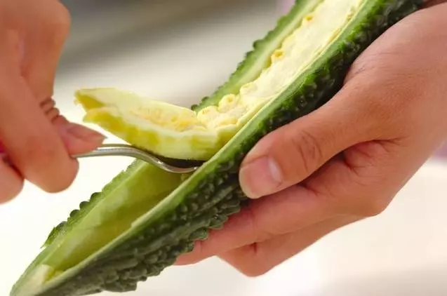冷蔵保存の方法と同じように、ゴーヤを縦半分にカットしたら、種とワタをスプーンなどでやさしく取り除きます。②薄めにスライスする