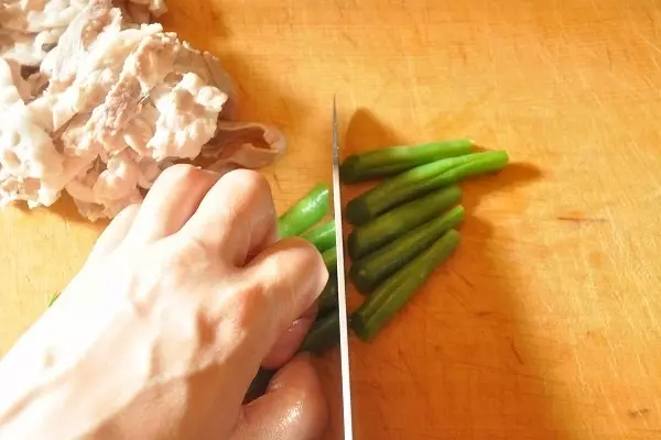 3、サヤインゲンは軸側を少し切り落とし、長さ3~4cmに切る。豚肉は長ければ食べやすい幅に切る。