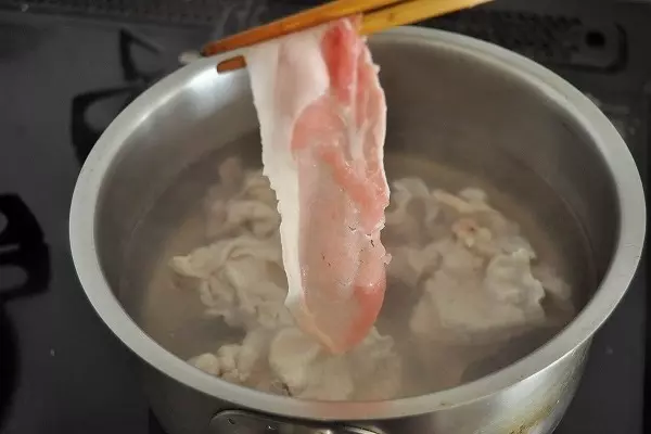 2、鍋に湯を沸かして酒を加え、弱火にして豚肉を一枚ずつ火を通してザルに上げる。
