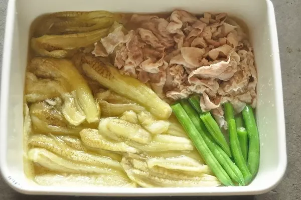 3、サヤインゲンは軸側を少し切り落とし、長さ3~4cmに切る。豚肉は長ければ食べやすい幅に切る。