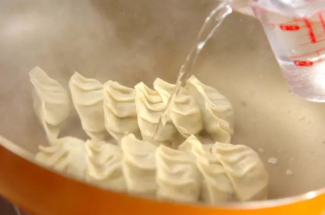 フライパンを強火にかけます。すぐに、餃子の高さの1/4ほどまでお湯を注ぎます。水を使用すると、フライパンの温度が下がってしまい、仕上がりが水っぽくなる原因に。できるだけ、水ではなくお湯を使うようにしてみましょう。