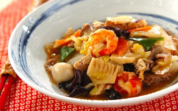 作り方は、フライパンにサラダ油を強火で熱し、厚揚げ、豚肉、エビを炒めます。続いて、ニンジン、白菜、水煮タケノコを炒め合わせ、合わせ調味料を加えましょう。煮たったらウズラの卵、ピーマン、キクラゲを加えて少し煮ます。野菜が柔らかくなったら、水溶き片栗を全体に加え、よく混ぜながらトロミをつけ、最後にゴマ油を加え、全体に混ぜ合わせれば完成です。