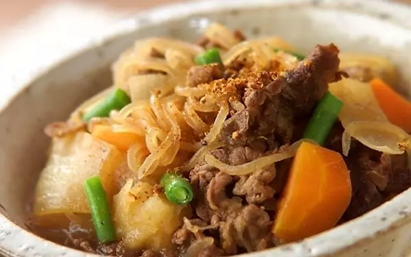 蒸し暑い季節は、肉じゃがもあっさりと味わいたいですよね。こちらのレシピなら、それが可能に。しっかりと煮込むことで、食材に味がよくしみ込み、ホクホクしていて美味しいです。仕上げにお好みで、サヤインゲンを散らし、七味唐辛子を振りましょう。