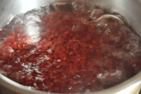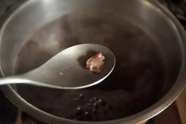 2、鍋に(1)の小豆と水を入れて強火にかける。煮たったらアクを取って弱火にし、40~50分煮汁がヒタヒタになるまでゆでる。指で小豆が柔らかく潰れることを確認する。