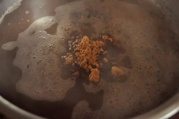 3、黒糖を2回に分けて加えてアクを取りながら5分煮る。火を止めて蓋をし、そのまま冷ます。