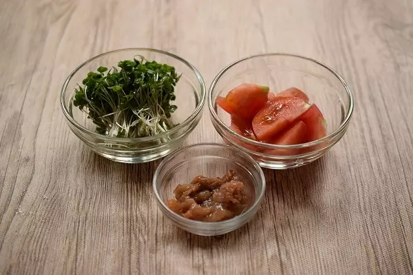 ・ブロッコリースプラウトは根を切り落とし、洗って水気を切る。