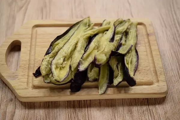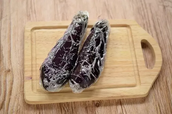 4、ナスのラップを外し、ヘタを切り落とす。皮が付いたまま、縦に食べやすく裂く。