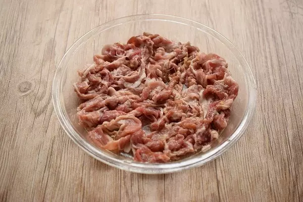 2、豚肉を耐熱容器に入れ、<下味>の材料を揉みこむ。なるべく固まらないように、皿いっぱいに肉を広げる。ラップをかけ、3分加熱する。一度取り出し、菜箸でほぐす。ラップをかけ、さらに2分加熱する。後は様子をみて、肉に火が通るまで30秒ずつ加熱する。