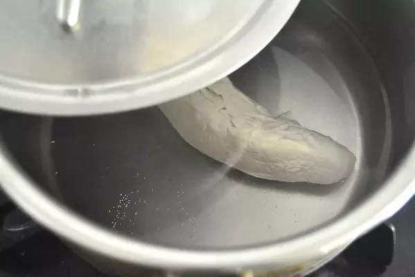 ・鶏ささ身は筋を引く。鍋に水と酒を入れて強火にかけ、煮たったら鶏ささ身を入れて火を止め、鍋に蓋をして余熱で火を通す。ゆで汁はワカメスープ用にとっておく。