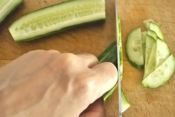 1、キュウリは両端を少し切り落として長さ半分に切り、さらに縦半分に切って斜め薄切りにし、塩で和える。