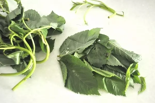 2、モロヘイヤは葉を茎からちぎって分け、熱湯で30秒ゆでて冷水に放ち、水気を絞る。