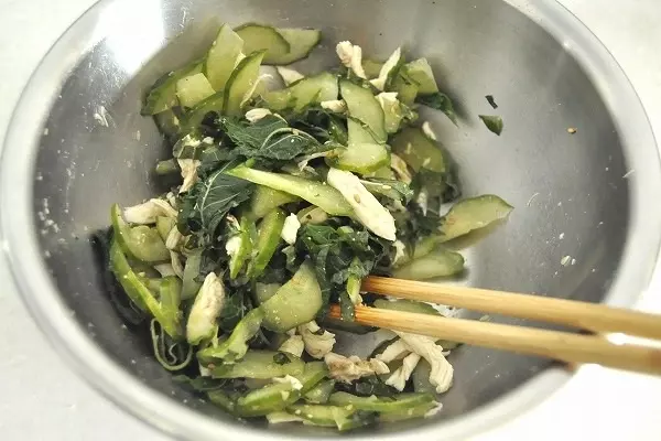 3、(1)に鶏ささ身を手で細かく裂きながら加え、モロヘイヤ、大葉、すり白ゴマを加えて和え、器に盛る。