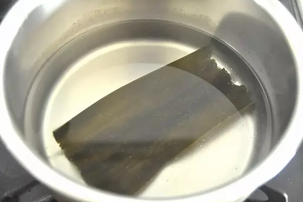 4、鶏ささ身のゆで汁に昆布を入れて中火にかけ、煮たったら昆布を取り出してアクを取る。
