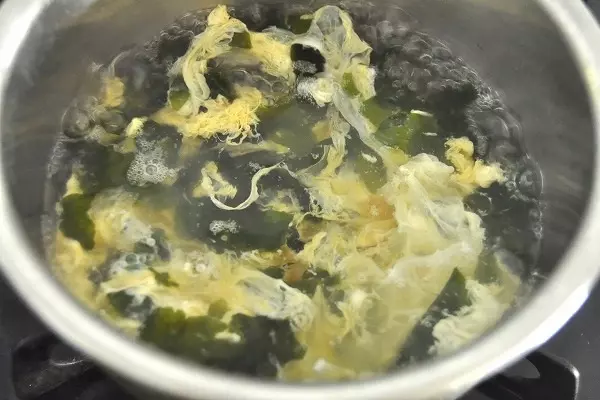 5、ワカメを加え、溶き卵をまわし入れて火を通し、塩で味を調えて器に注ぎ入れる。