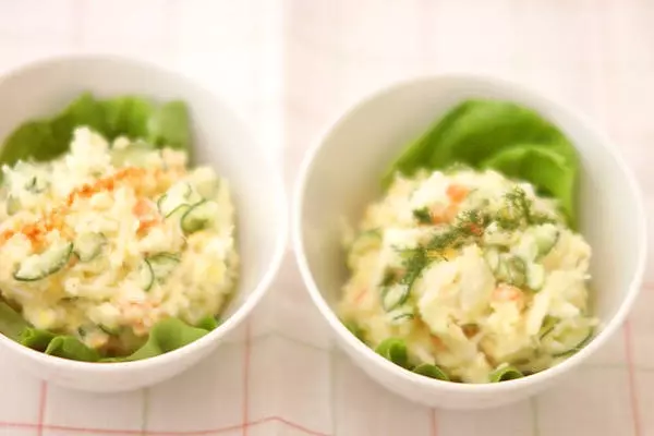 手順6:粗熱が取れれば、マヨネーズ、マスタード、レモン汁、砂糖、コショウを加えてよく混ぜ合わせ、更にキュウリを混ぜ合わせる。器にサラダ菜を敷いて盛りつけ、パセリを散らす。